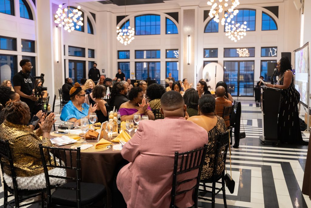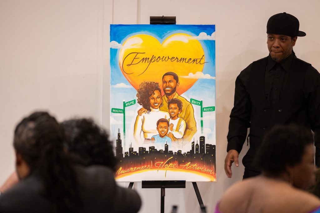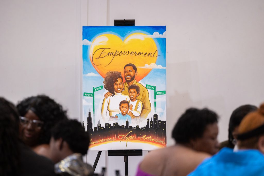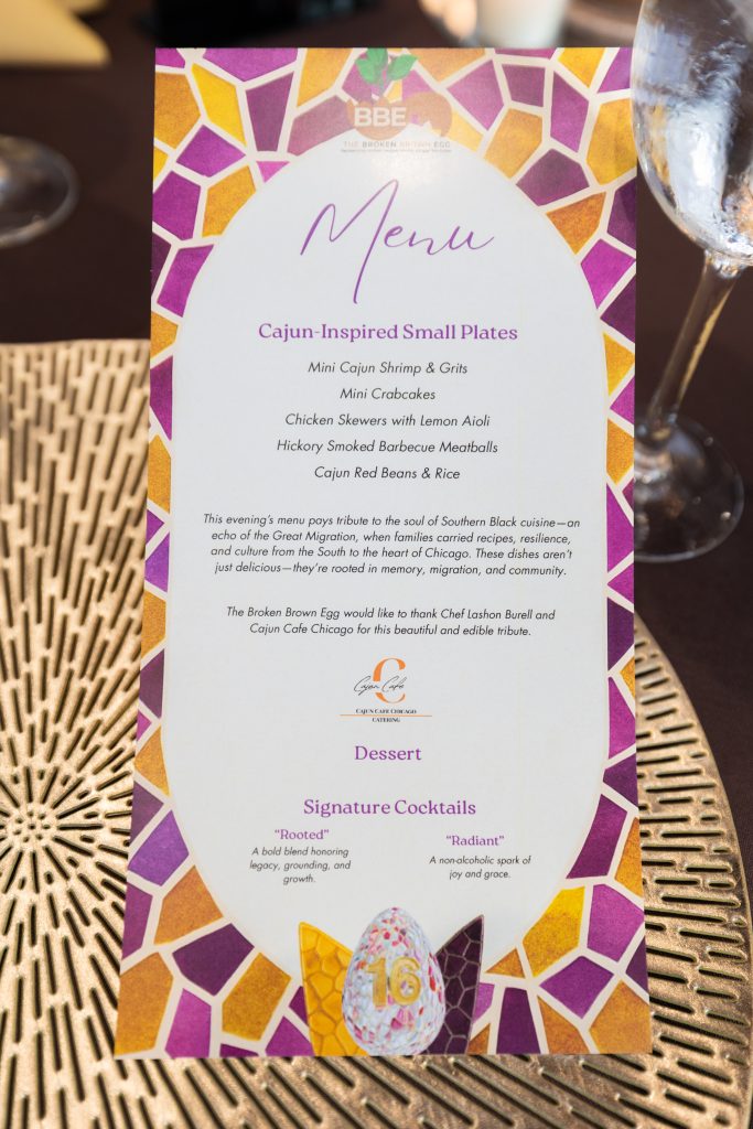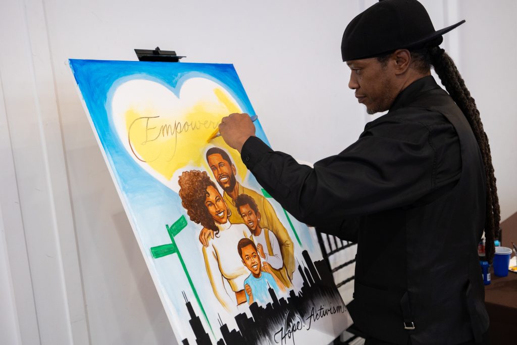 Our emcee, Shartia “Love” Jones brought warmth and rhythm, guiding the evening with compassion and charm. Chef Lashon Burrell of Cajun Cafe Chicago gave us some delicious bites while the crew from LVLS Creative captured it all, ensuring that the beauty of the night lived beyond the ballroom. Guests enjoyed a live painting display from Jerrold “Just Flo” Anderson followed by a chance to bid on it.